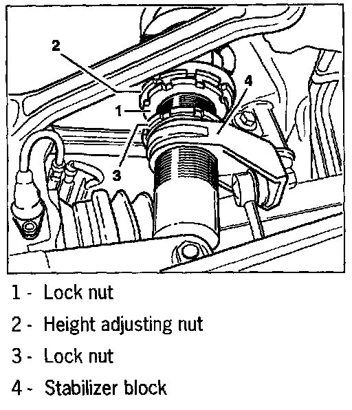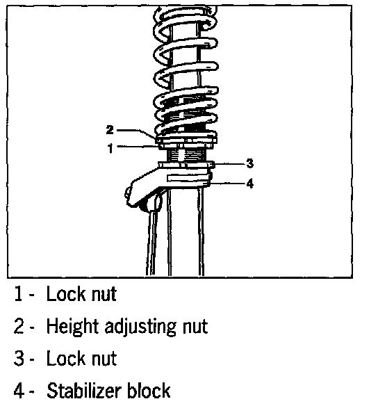 The front and rear axle spring strut has a thread and a height adjusting nut -2- for height adjustment. The height adjusting nut -2- is secured against turning by the lock nut -1-. The stabilizer block (mounting saddle for the stabilizer mount) -4- is also fitted on the thread. The stabilizer block can be vertically adjusted and it is provided with a lock nut -3-. This adjustment possibility is only useful for racing. It can be used to ensure that enough clearance is available for the stabilizer mount even for deviating vehicle heights (only for racing) and also that the stabilizer mount can be fitted free of tension. The stabilizer block -4- does not need to be adjusted for the vehicle height prescribed for street use. The stabilizer block is also adjusted for replacement dampers.