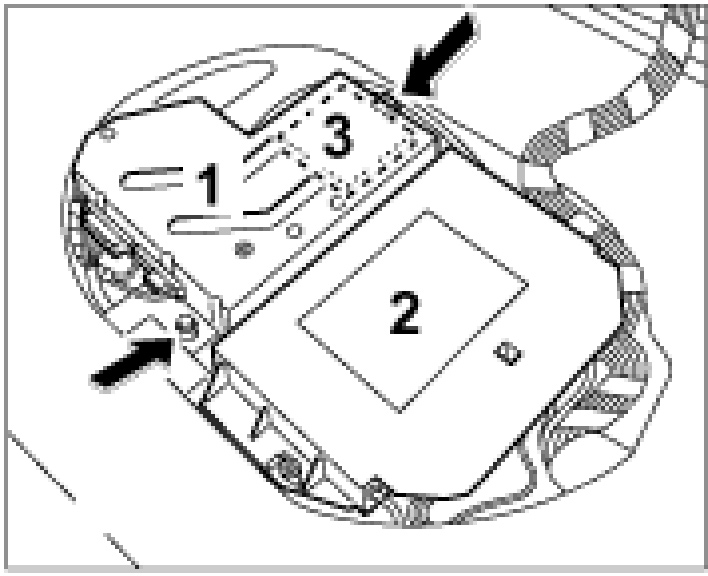 18. Insert the tilt sensor -3- into the cover -1- and screw the cover tight to the floorpan using the fastening screws -arrow-.