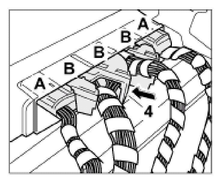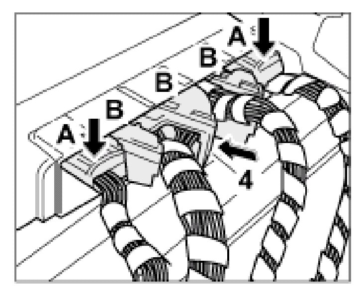 6. Push in connectors -B- locking -arrow- and actuate the latching lever -4-.