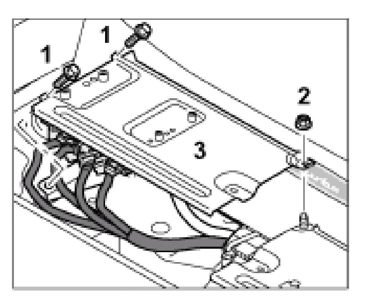 4. Turn the control module holder -3- and push it in under the fastening nut -2-. Tighten both fastening screws -1- and the fastening nut -2-. Tightening torque: 10 Nm (7.5 ft.lb.)