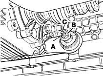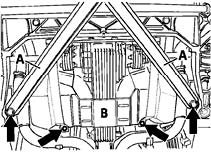 ^ If the hexagon-head bolt (M10 x 90) was undone on the rear transmission support/transmission mount, it is important to tighten the front transmission support first, then the rear transmission support and the M10 x 90 screw on the rear transmission mount last.