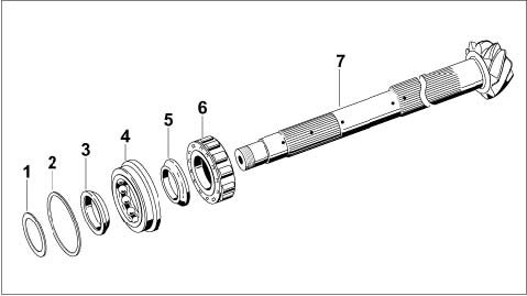 1. Remove adjusting shims (nos. 1 and 2 in overview) from shaft. Note the quantity and thickness for reinstallation.