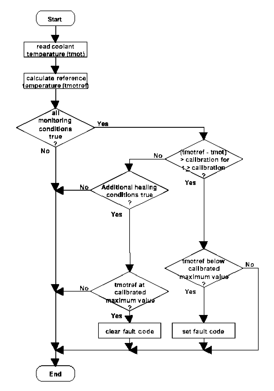 Due to a missing or stuck open thermostat the cooling temperature rise is delayed, especially at low ambient temperatures. The picture below shows an overview of the monitor. The thermostat monitor is designed to detect a delay in the warming up of the engine coolant temperature. Therefor the calculated reference temperature (based on coolant temperature at maximum heat radiation with functioning thermostat) is reused. At enabled monitoring conditions the difference between the calculated reference temperature and the coolant temperature is checked. If the difference is above a calibrated threshold for a calibrated period of time and the calculated reference temperature has not yet reached its maximum value, the fault is detected and its fault code is set. If the difference remains below the calibrated threshold for a time period longer than the above mentioned time an error from a previous warm up cycle may be cleared as soon as the calculated reference temperature has reached its maximum value.