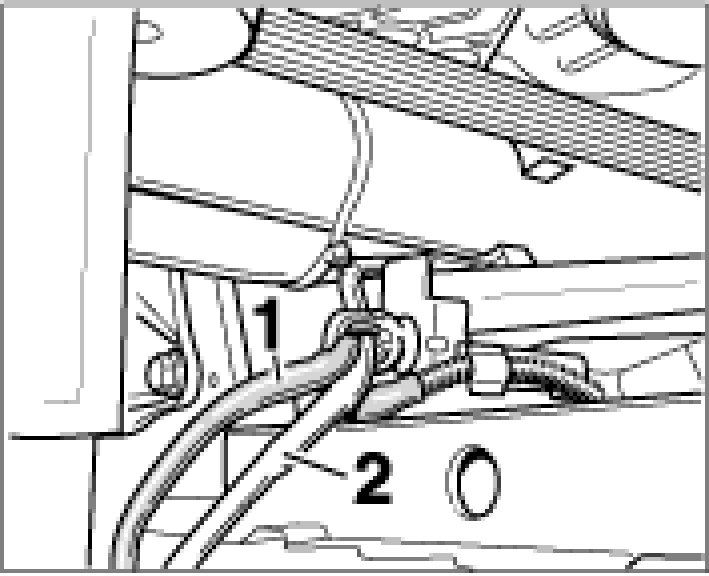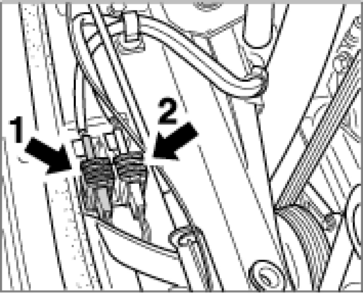 3. Unclip the blue cable -2- of the oxygen sensor in front of the catalytic converter from the cable guide and the sheetmetal brackets on the engine strut.