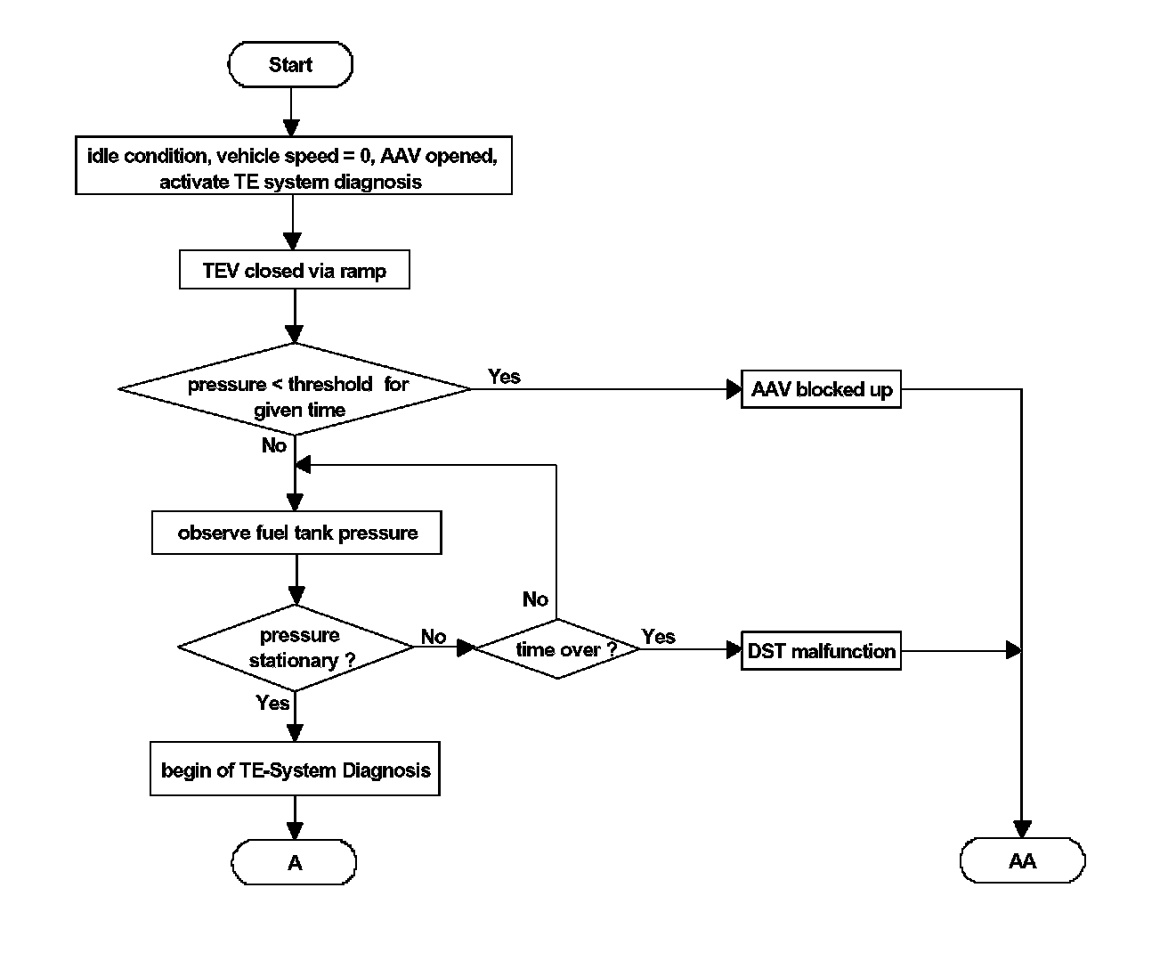 If the pressure is steady and the AAV closed, the pressure increase caused by fuel evaporation is measured and stored after a certain period. If the pressure reaches a specific threshold, monitoring is stopped, because the fuel evaporation is excessive. If the pressure reaches a specific threshold (vacuum), a TEV malfunction is detected (TEV stuck open) and monitoring is stopped.