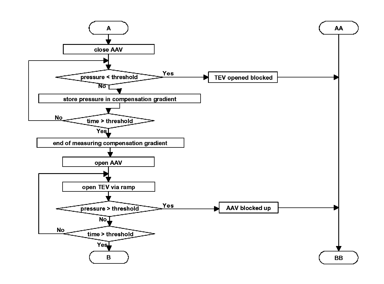 The AAV is opened and TEV are opened by a constant increase in their duty cycle. If the pressure reaches a specific threshold (vacuum), an AAV malfunction is detected (AAV blocked) and monitoring is stopped. If the pressure does not reach this specific threshold and the TEV has reached a certain duty cycle, the AAV is closed after a time delay.