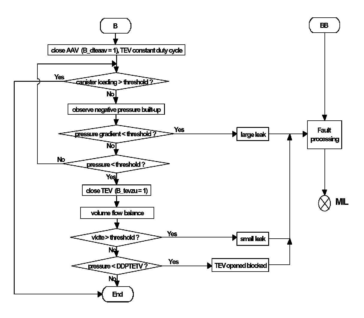 If a large lean correction of the lambda controller is detected, monitoring is stopped. If monitoring were to be continued, idle instability will occur because of the high canister load. If the negative pressure build-up gradient is below a certain threshold, a large leak is detected and the diagnosis is complete. If the pressure reaches a certain threshold (ex. -8 hPa), the TEV is closed. If the pressure reaches a specific threshold (ex. -15hPa), a TEV malfunction is detected (TEV stuck open) and monitoring is stopped.