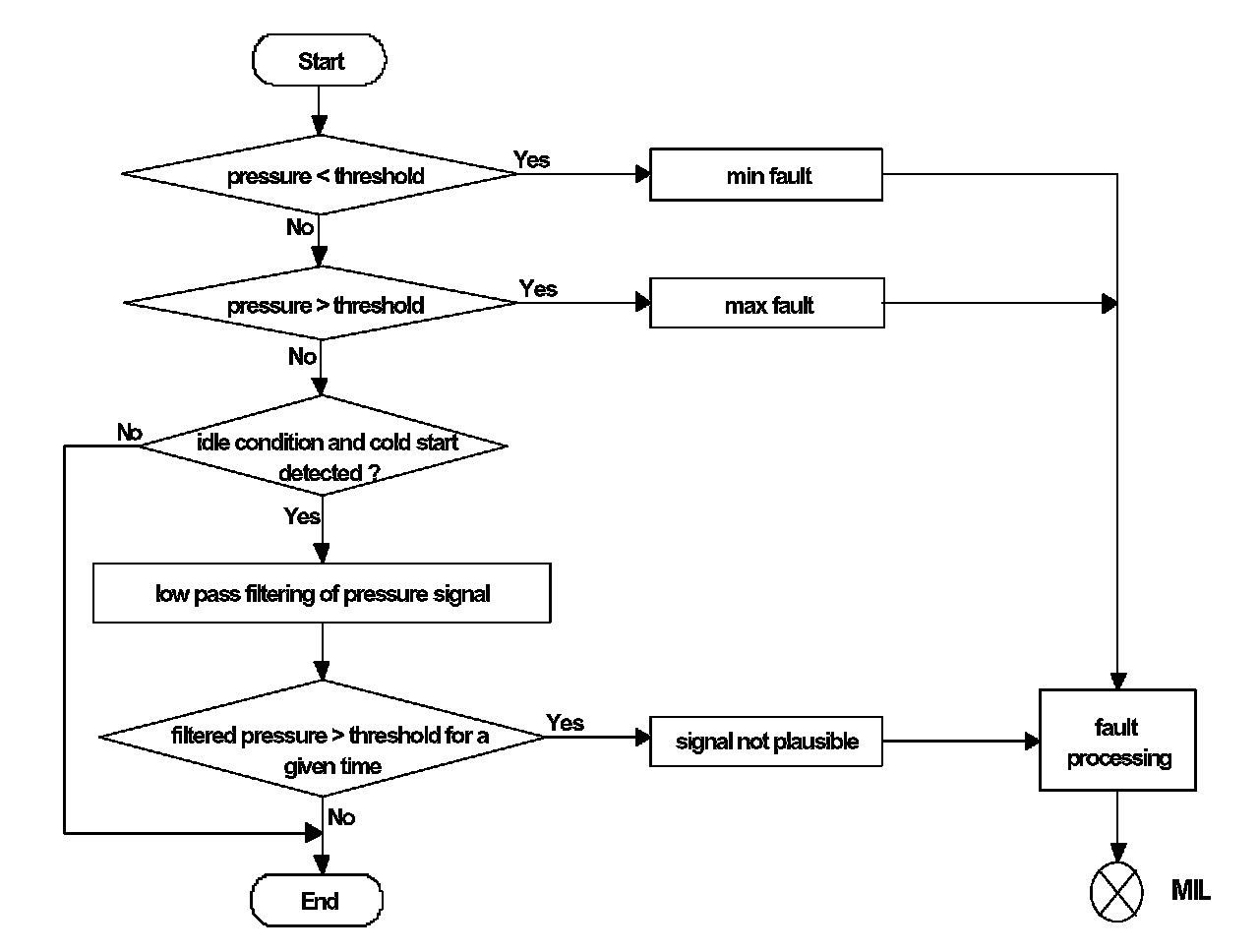 The functional plausibility check is performed only when an idle condition and a cold start are detected. In this case the low pass filtered pressure signal is monitored. If the filtered pressure exceeds a specific threshold for more than a given period, a sensor signal which is not plausible is detected.