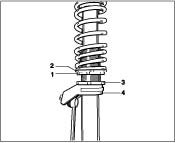 The vehicle height on the front and rear axle is adjusted by turning the adjusting nut -No. 2-. The lock nut -No. 1- must first be loosened. Use a hook wrench or special tool 9647 (hook wrench insert) for this purpose.