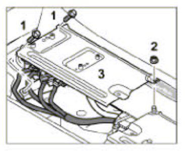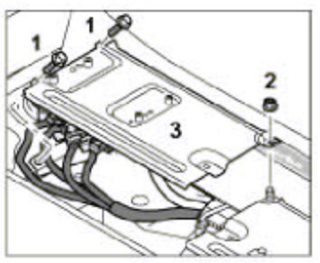 4. Turn over the control module holder -3- and push it in under the fastening nut -2-. Tighten both fastening screws -1- and the fastening nut -2-. Tightening torque: 10 Nm (7.5 ftlb.).