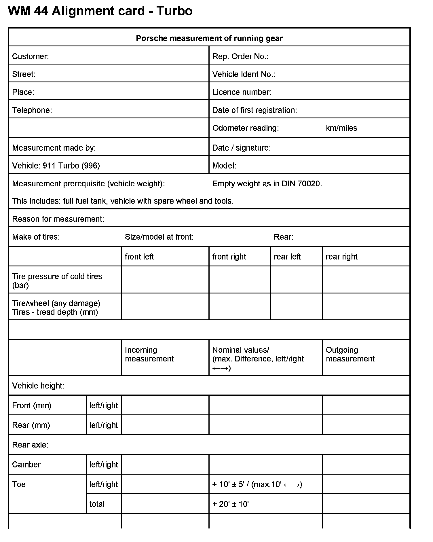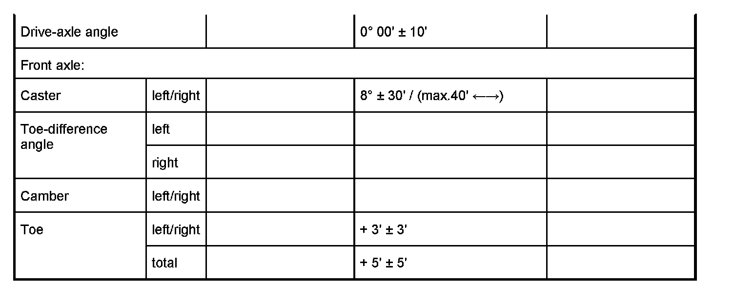 Since mainly electronic wheel-alignment testers in conjunction with printers are used, a specimen alignment card is rarely required nowadays. In order for measured results to be documented in individual cases, however, a copy of the alignment card shown above can be used.