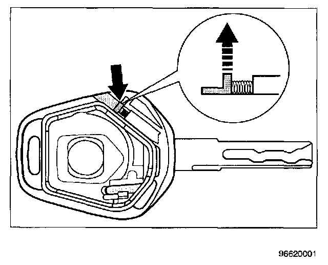 1. In order to remove the key from the bottom part, the compression spring in the sliding latch is compressed and held with a small screwdriver.