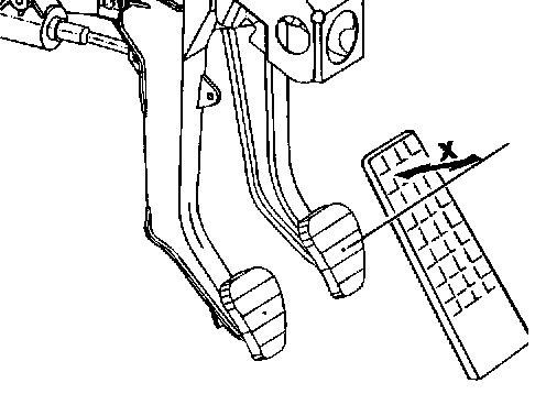 The brake pushrod is correctly set if the dimension X is 45 + 5 mm. Perform measurement between the center of the brake pedal plate and the accelerator.