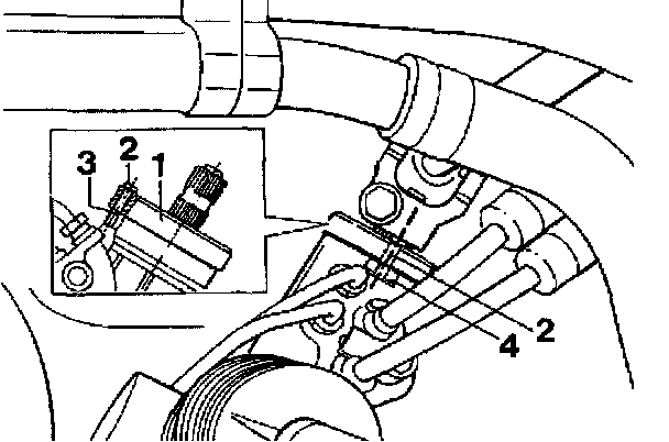 No. 3 is the desired breaking point for pins in new steering gears. (New) pin No. 2 is inserted into driver No. 1 and lies with its underside within the recess of lug No. 4. This locks the steering gear in the center position. After installation of a new steering gear, the lower part of the pin is sheared off (at the desired breaking point No. 3) by turning the steering wheel. The upper part of the pin remains in the driver.