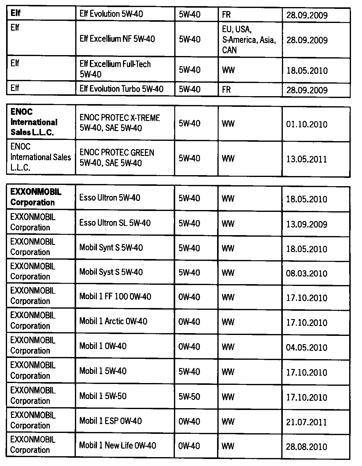 --> Manufacturer's Certificate 'Allocation of approved engine oils (36/08)'