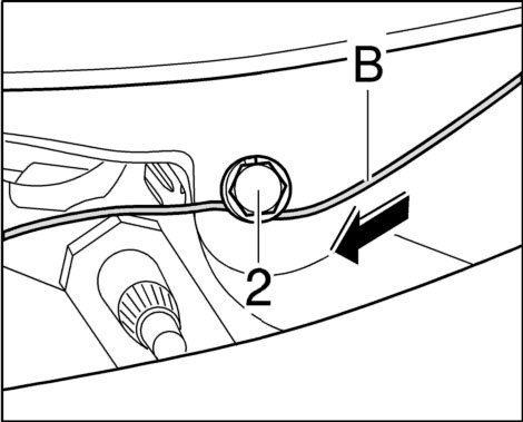 5.1. Attach the loose end of the cutting thread -B- firmly at a suitable point on the body with the fastening screw -2- of a component (e.g. wiper motor fastening). To do this, unscrew the fastening screw, wind the cutting thread -B- around the screw and tighten the fastening screw again.