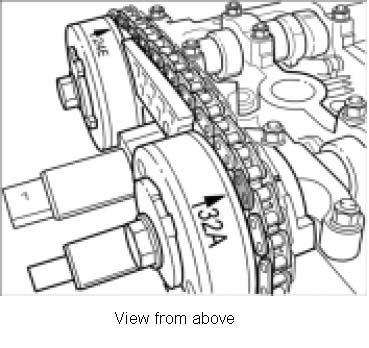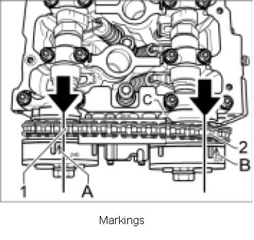 and B- on the camshaft adjusters must be aligned with the notches