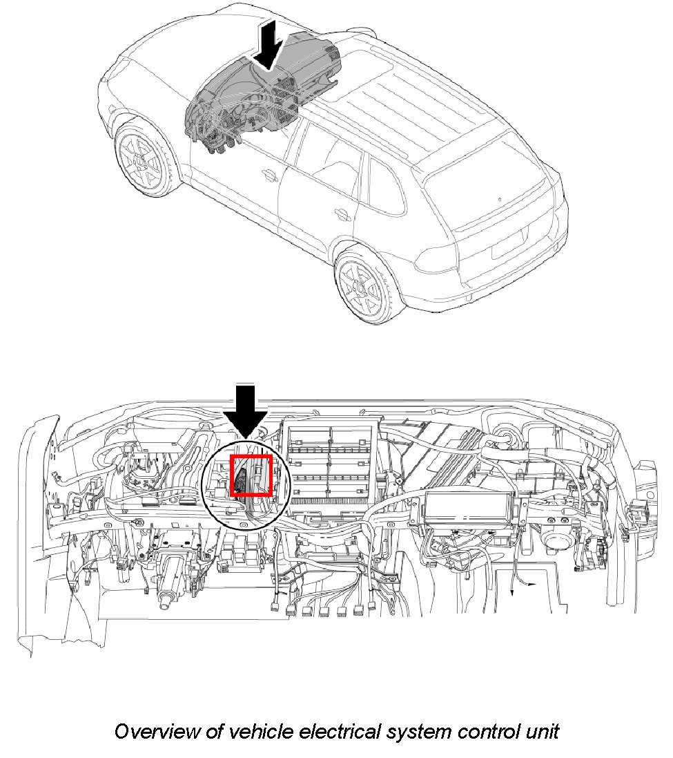 - If the control unit for the vehicle electrical system is replaced, it must be programmed using the Porsche System Tester. This will ensure that the control module is taught for the relevant vehicle, country version and equipment.