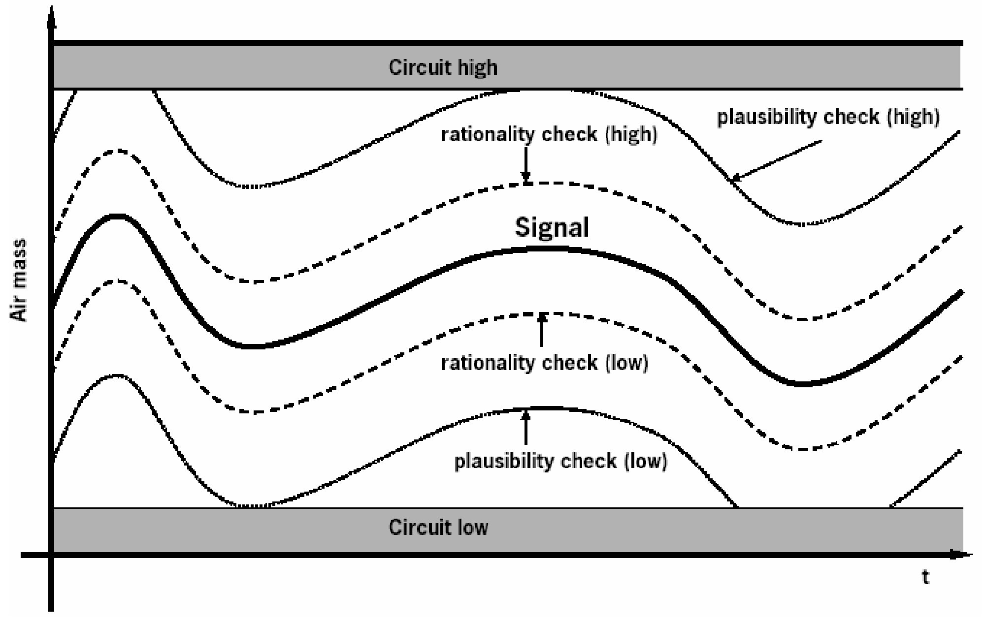 The output voltage of the air mass meter is a measure of air mass. The diagnostic routine compares the mass flow measured by the air mass meter with a calculated mass flow, derived from engine speed an throttle position.