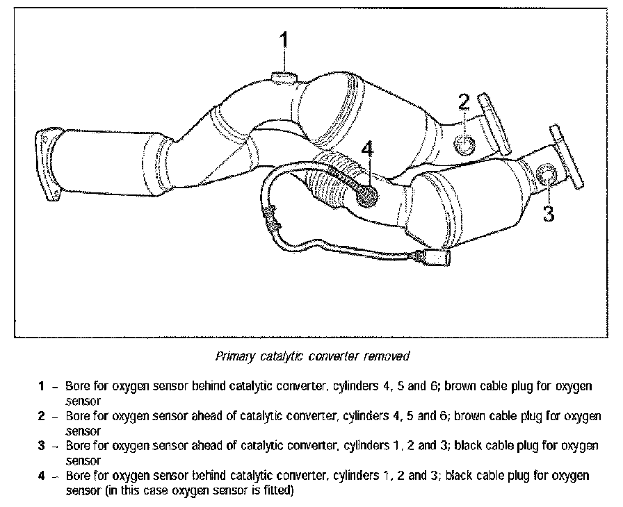 Note Cable plugs 1 and 2 belong 10 (he oxygen sensors behind catalytic converter wire plugs 3 and 4 belong to the oxygen sensors in front or catalytic converter The colors of the cable plugs are the same for each exhaust assembly.