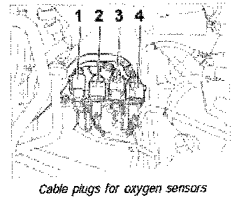 1. Disconnect cable plugs of oxygen sensors ahead of catalytic converter -3 and 4- and expose them.