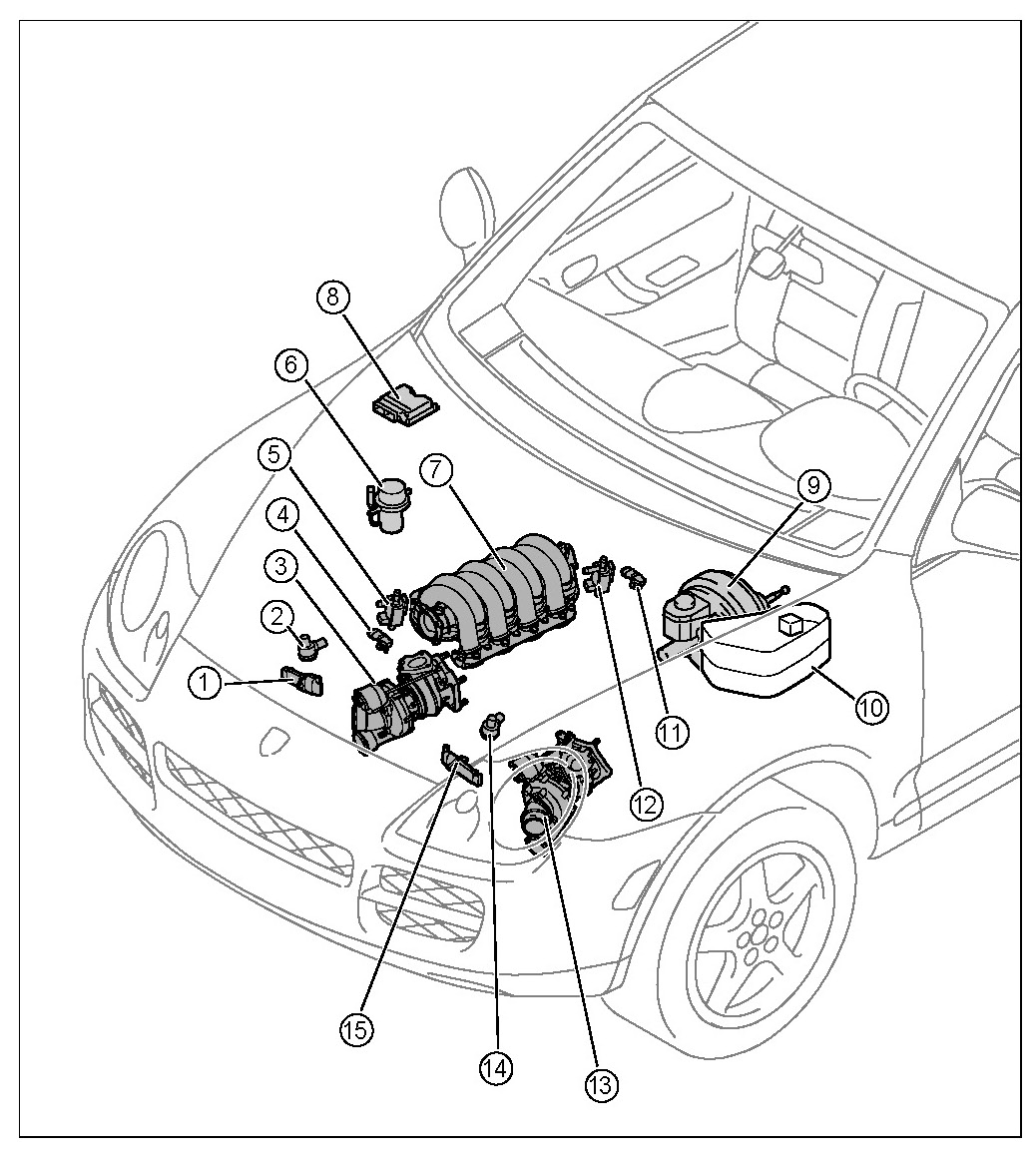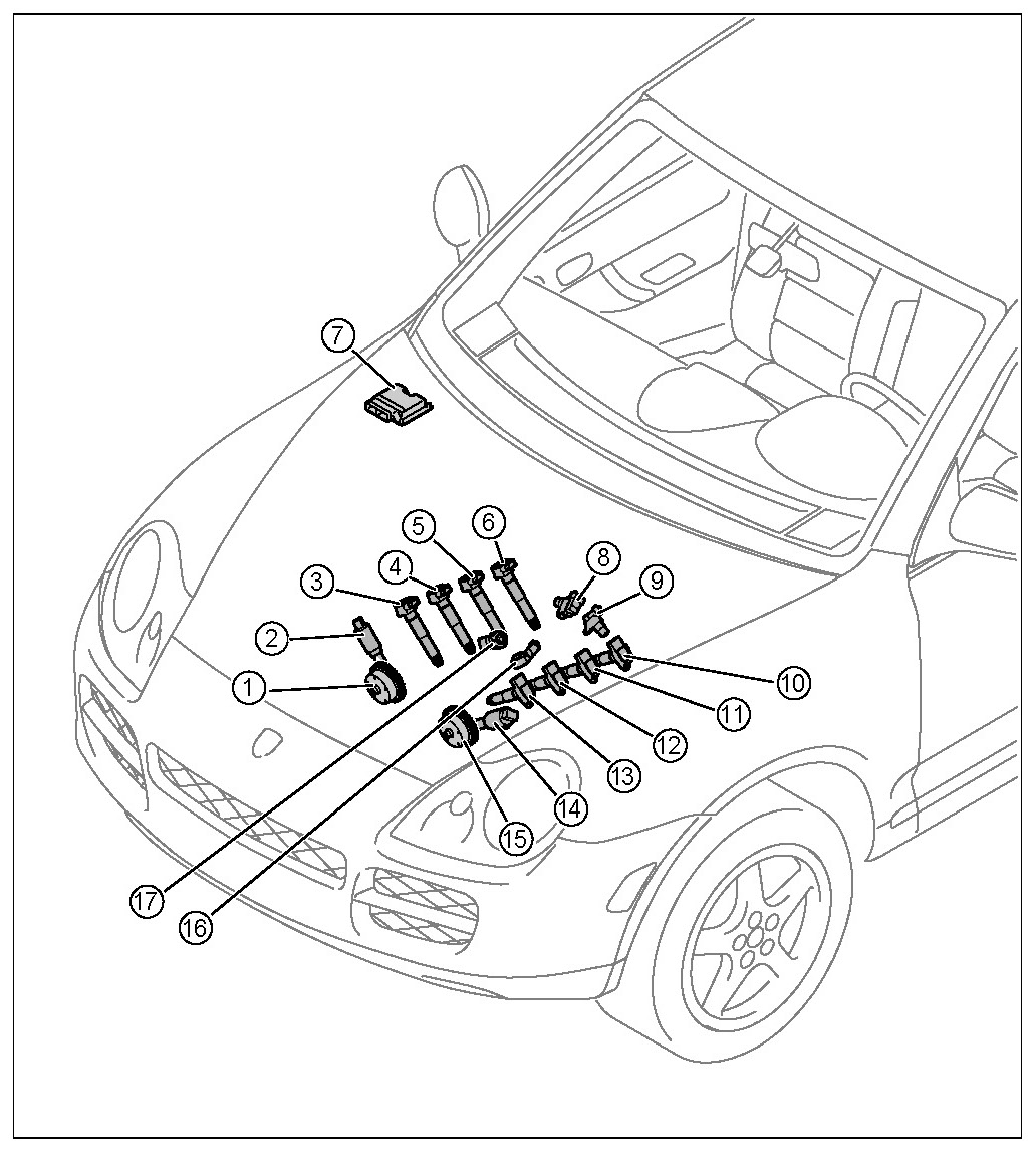 - Components close to the engine: the position of the components is shown from various views of the engine, making it easier to find your way around the engine compartment. Components that are actually hidden in the view are indicated or traced; hidden components can be recognised by the broken line between the item number and the component itself.