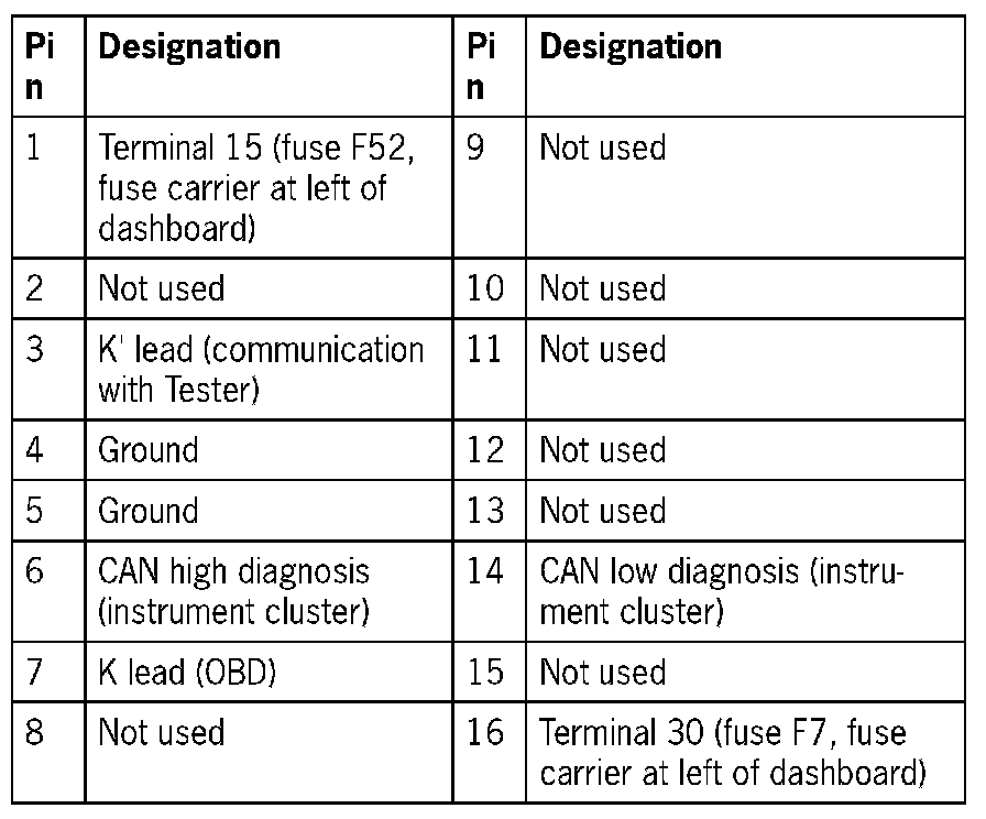 - Pin 3 'terminal 30 power supply via fuse F29/fuse carrier at right of dashboard'