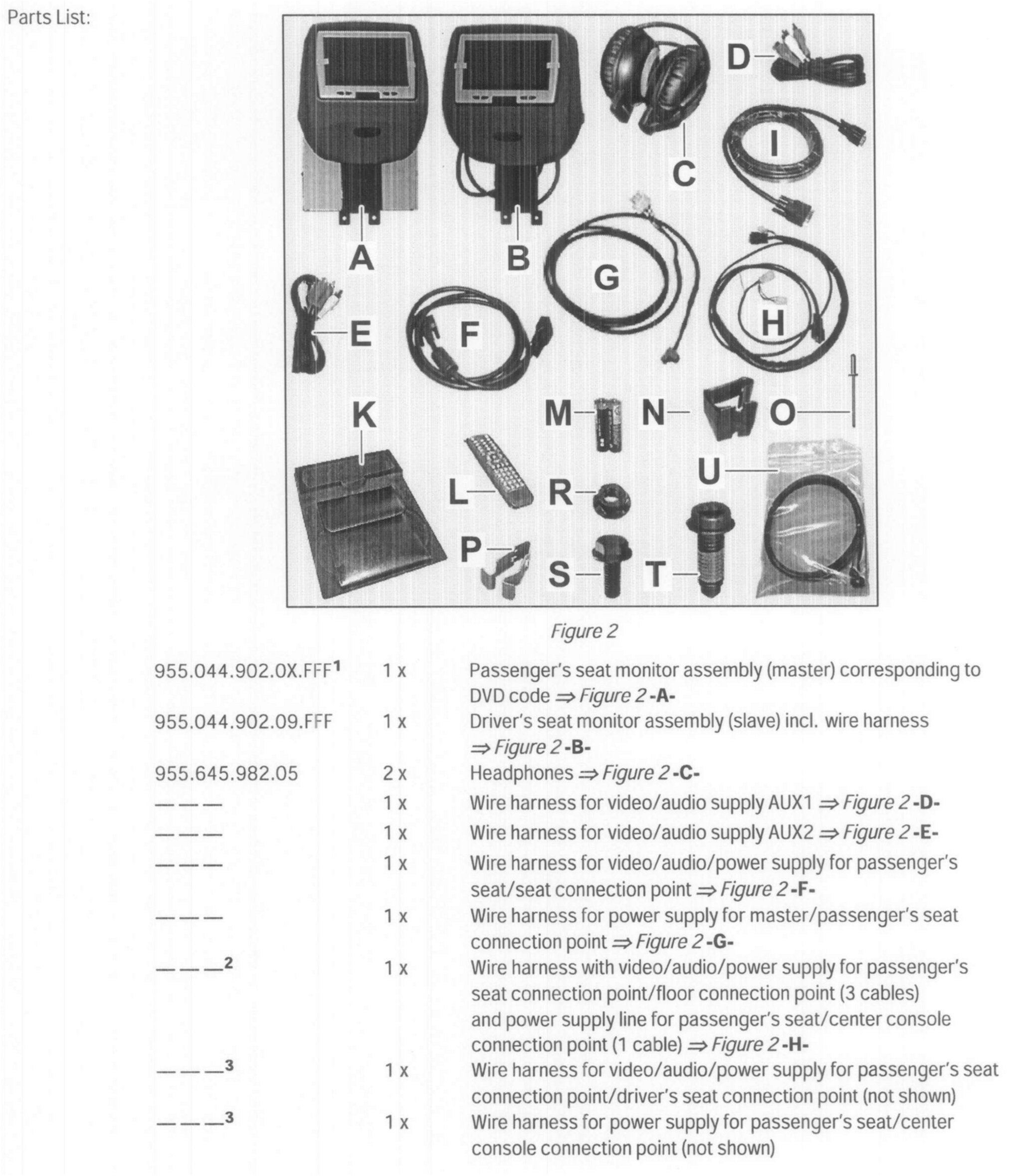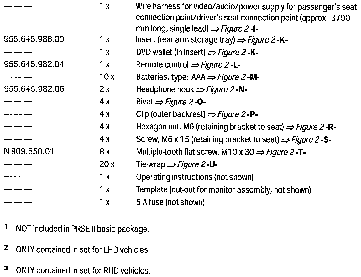 ^ Basic package consisting of: Driver's seat monitor assembly (slave), two infrared headphones, one remote control, operating instructions, various electric wire harnesses (for left-hand drive or right-hand drive vehicles for example) and small parts