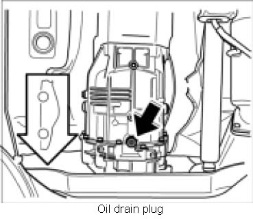 2. Unscrew oil drain plug -arrow- and drain transmission oil.