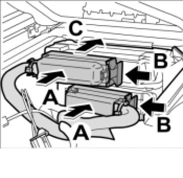 2. Insert the two connectors -A- and press in the locking mechanism -B- until it is felt to engage.