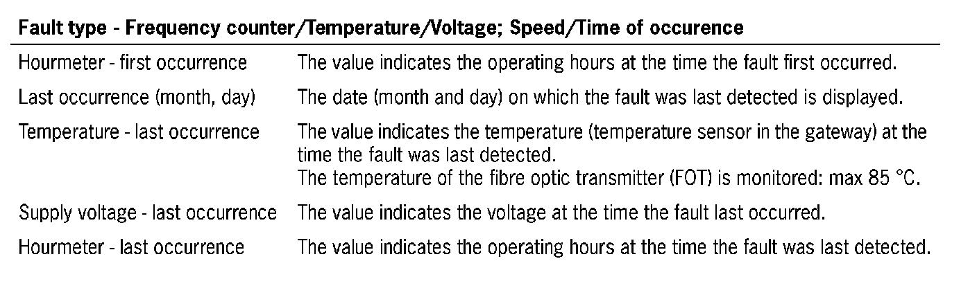 In order to be able to assess the fault exactly, the fault memory Info key [F8] must be pressed. This information should be saved using the Save key [F4] and printed out. If a fault code is stored with "not present" status and no other problems are present, then the fault memory must be erased.