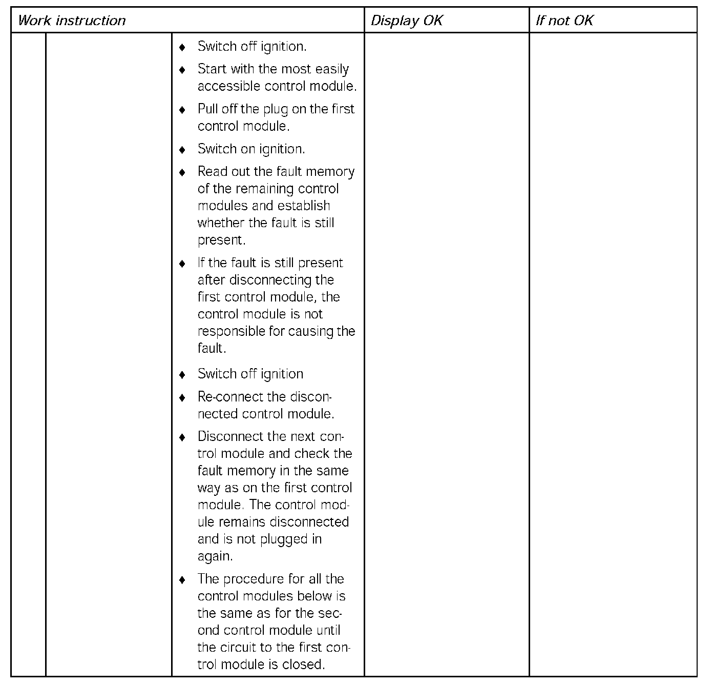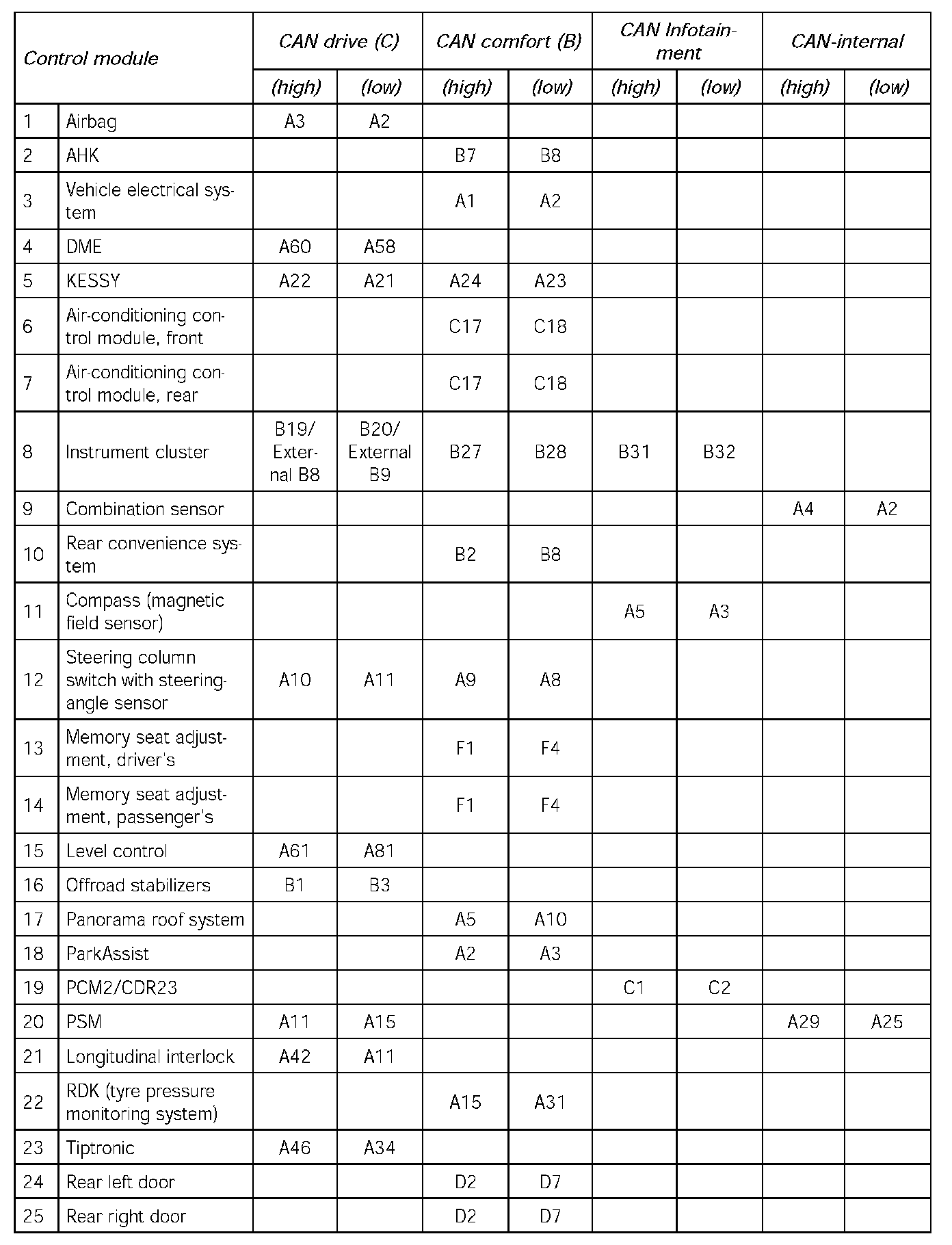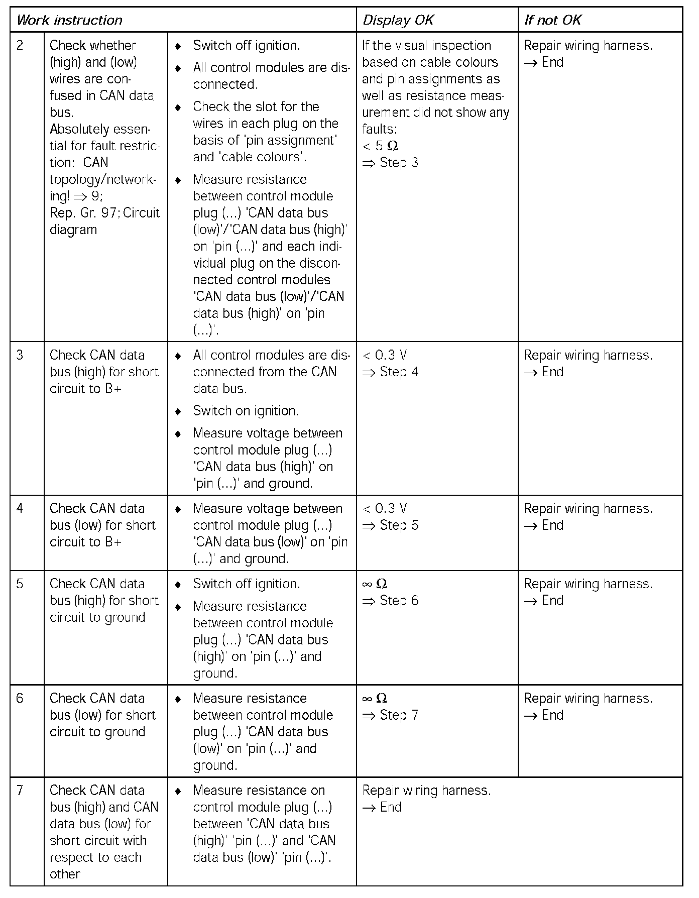 The measurements to be taken are listed in the work instruction below. The measurements must be implemented using the 'pin assignment' shown in the table below, while taking the relevant 'control module' and 'CAN data bus' into account.