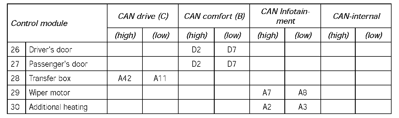 One of the following errors is memorised in all control modules: CAN drive (high/low)/ CAN infotainment (high/low)/ CAN comfort OFF (high/low)