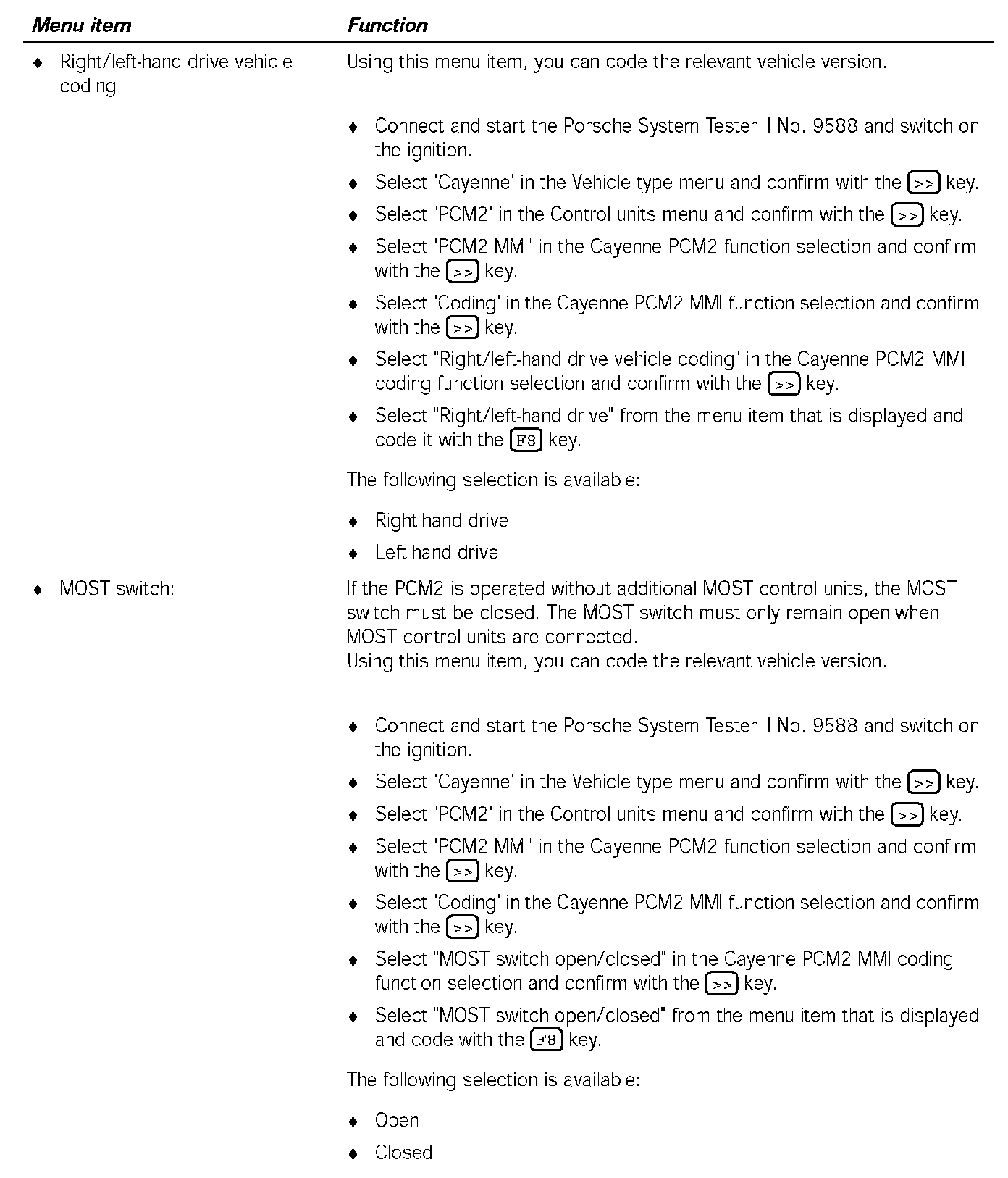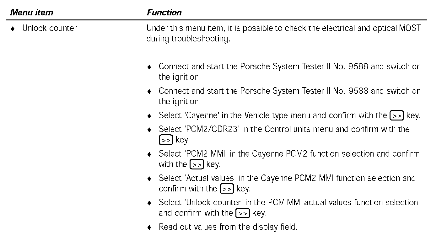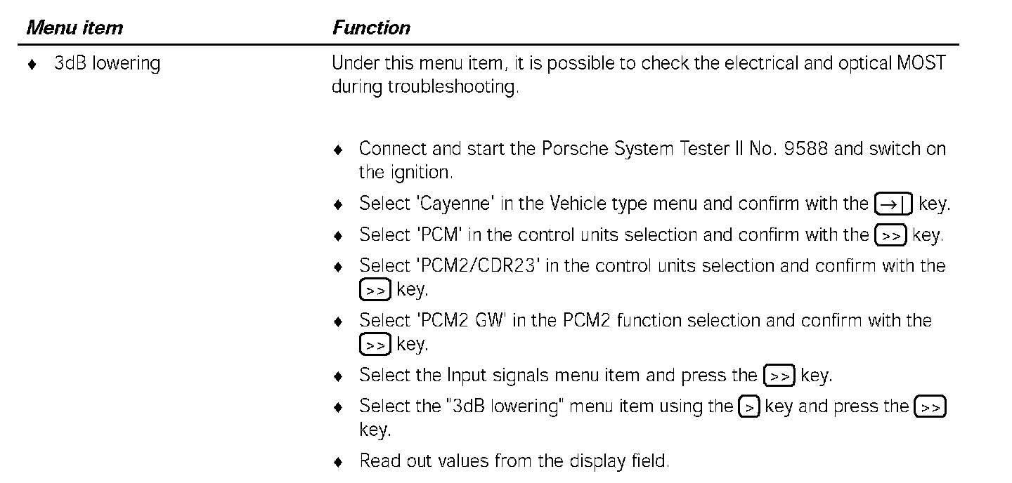 Communication between the Porsche System Tester II No. 9588 and the MOST control units only takes place via the K lead to the instrument cluster. The data is transferred from the instrument cluster gateway to the MOST control units, via CAN Comfort to the PCM2 gateway, via the electrical MOST in the PCM2 and via the optical MOST outside of the PCM2.