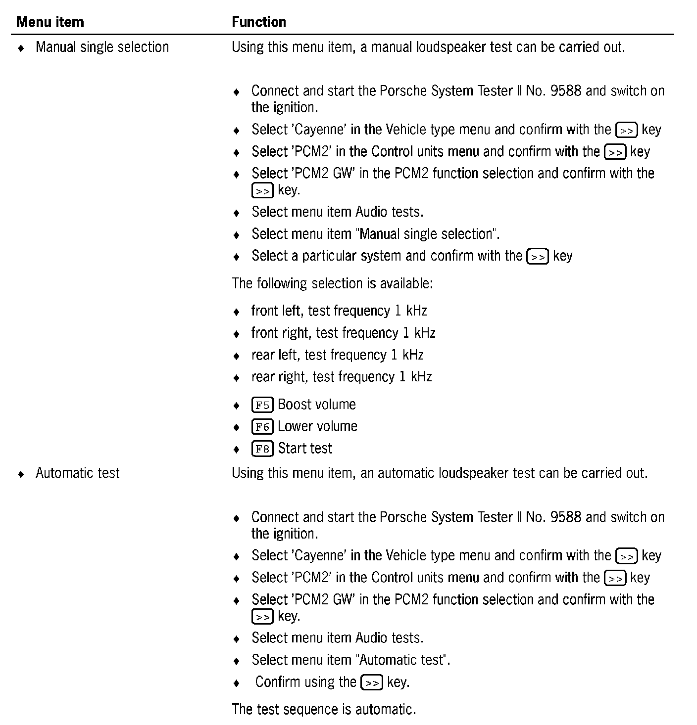 Using this menu item, you can carry out a check on the loudspeakers for vehicle equipment with no external amplifiers (BOSE or Harman). The following selection is available: