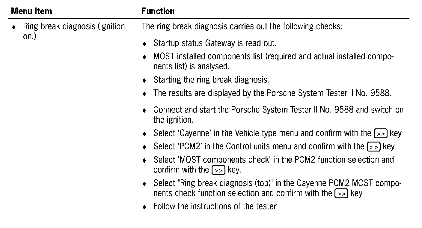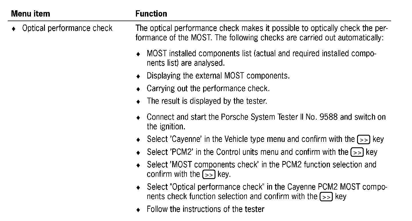 Communication between the Porsche System Tester II No. 9588 and the MOST control modules only takes place via the K lead to the instrument cluster. The data is transferred from the instrument cluster gateway to the MOST control modules via CAN Infotainment to the PCM2 gateway, via the electrical MOST in the PCM2 and via the optical MOST outside of the PCM2.
