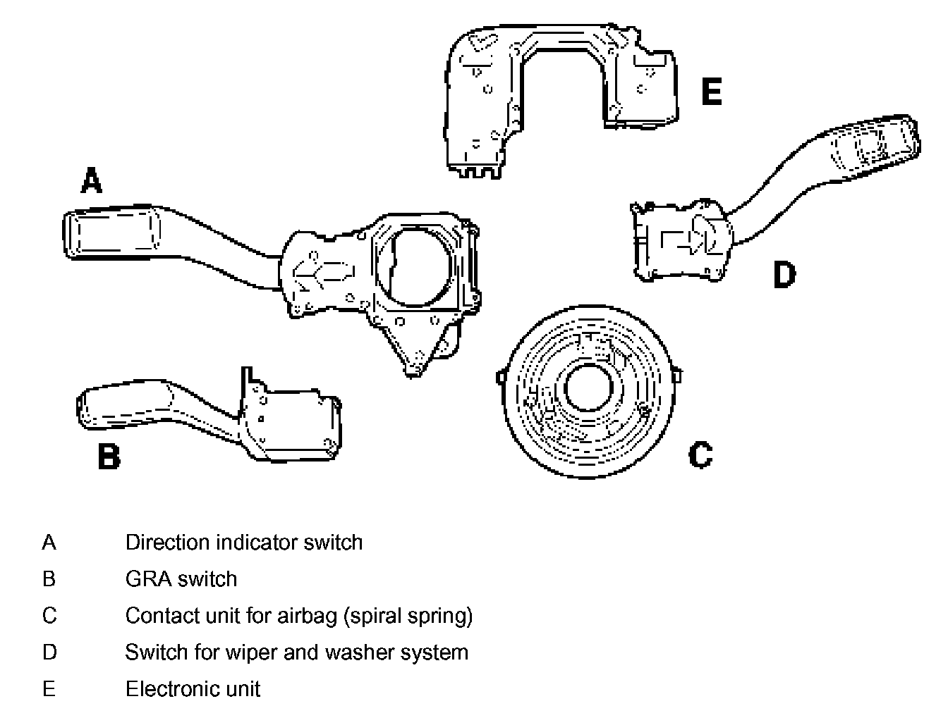 If faults have been diagnosed on the steering angle sensor, the steering column switch must be disassembled into the components -A, B, C, D, E-.