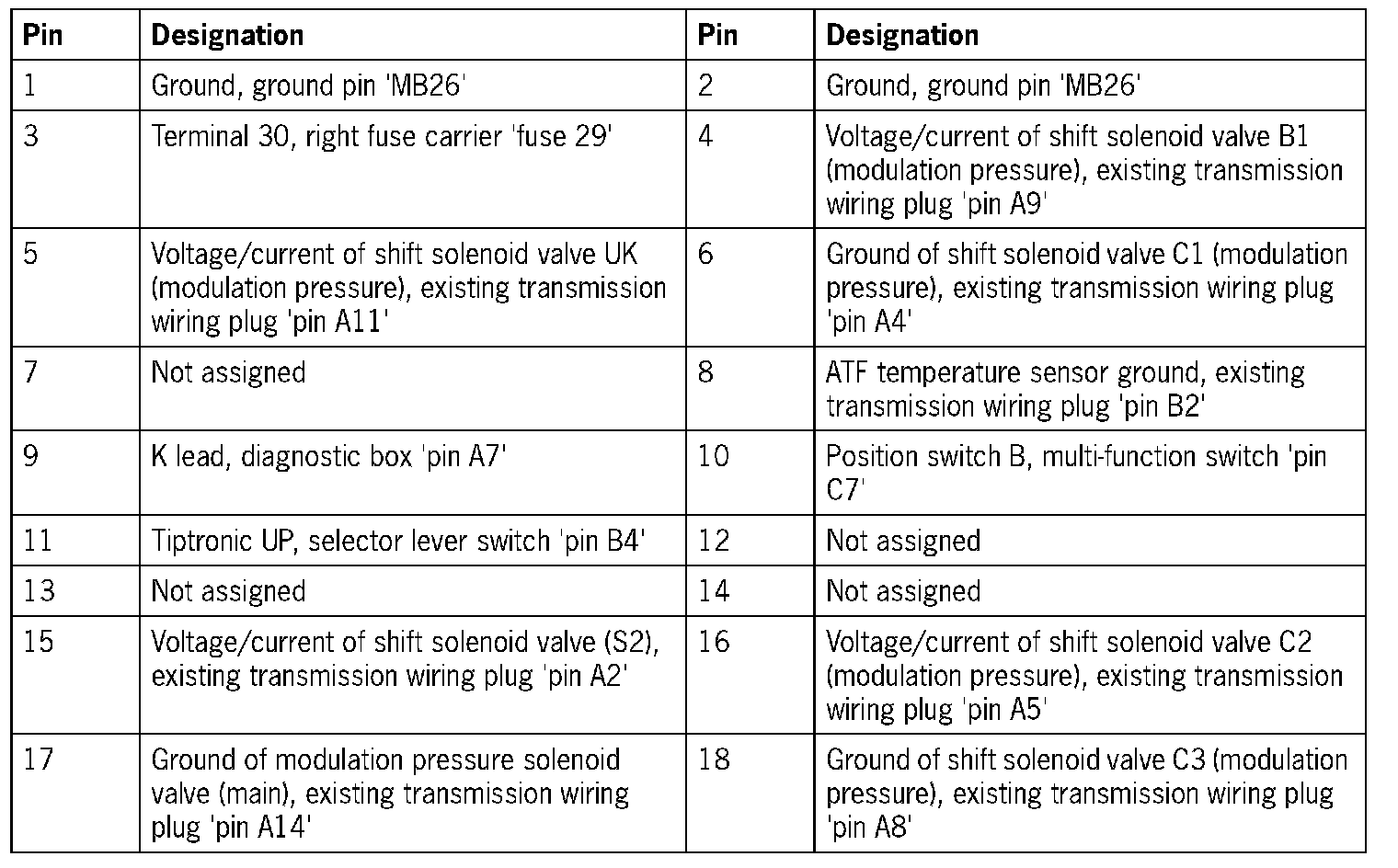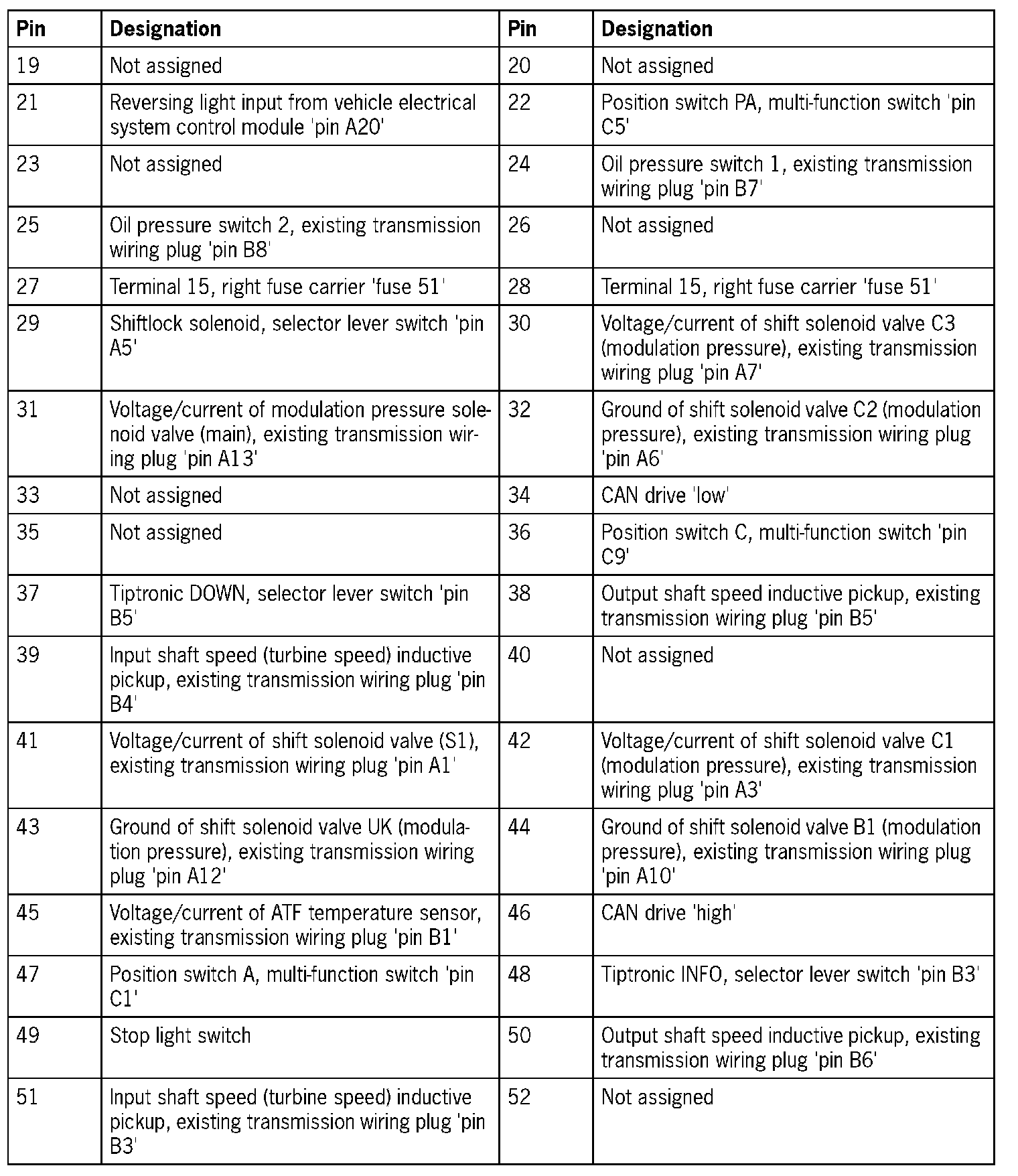 Connector assignmentTiptronic control module plug, '52-pin'