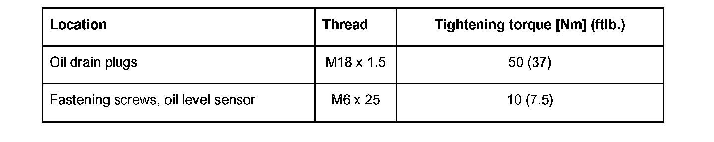 4. Clean oil drain plugs and screw in with a new aluminum sealing ring. Tightening torque 50 Nm (37 ft. lbs.).