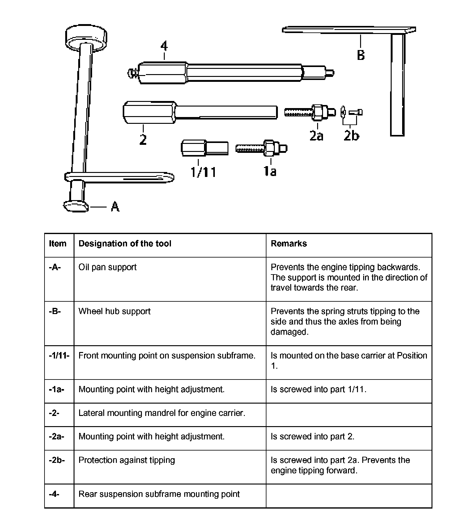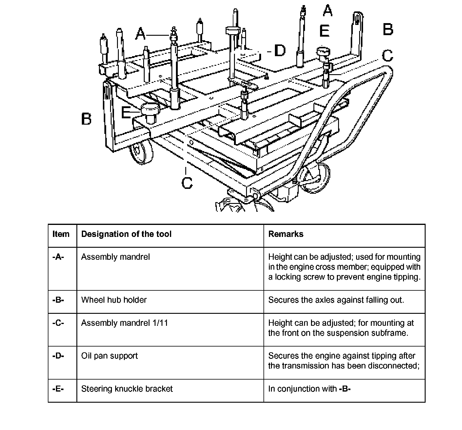2. Secure the engine against tipping. To do this, attach the safety locks on the engine cross member and raise the support under the oil pan until it touches the oil pan.