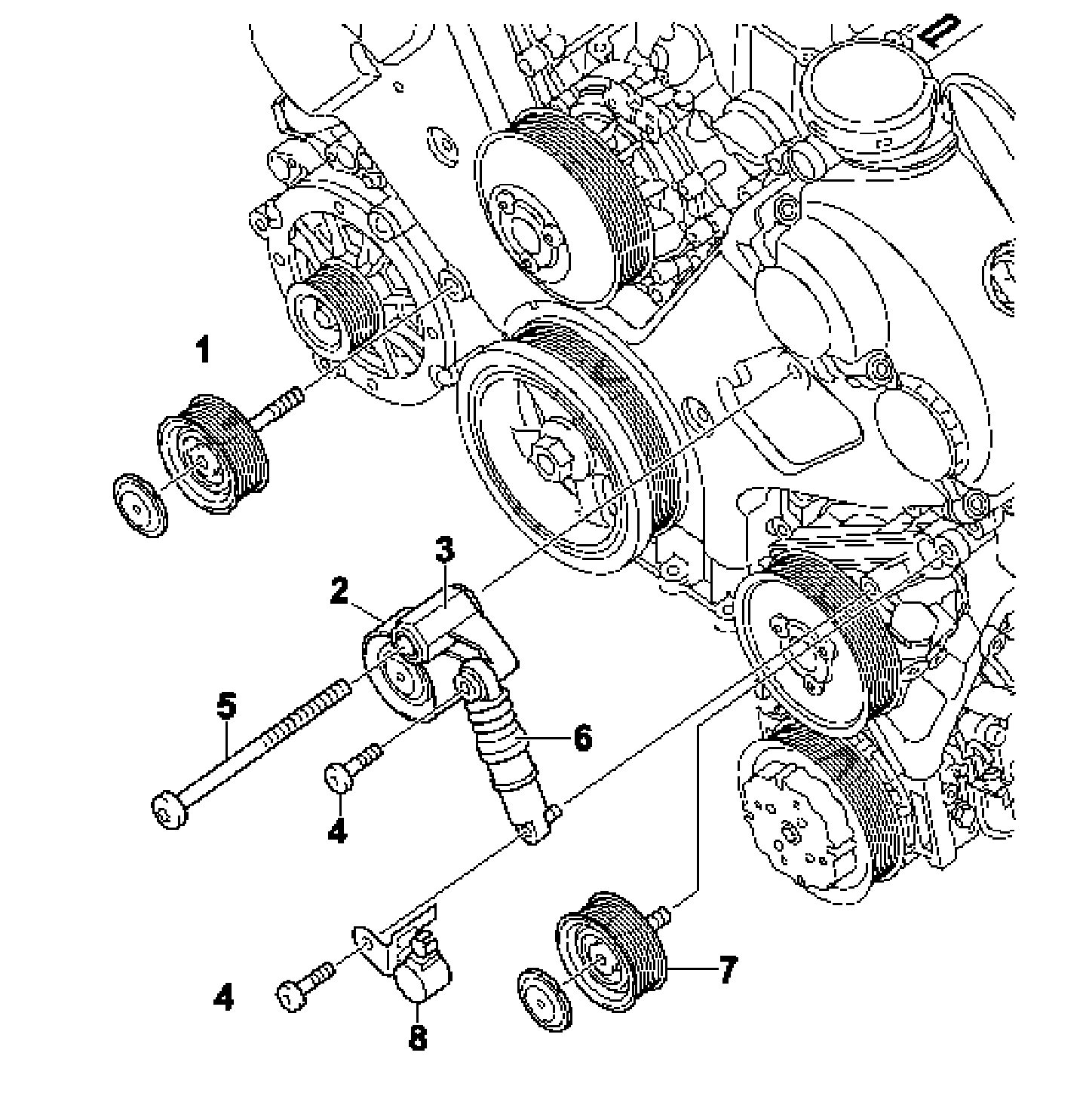 6. Dismantle belt tensioner. To do this, release fastening screws -4 and 5- on the carrier and on the underside of the shock absorber.