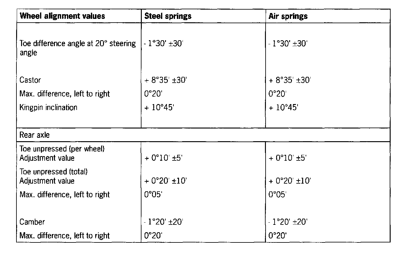 ^ If suspension alignment must be carried out on a vehicle within the first 200 km, e.g. following repairs arising from an accident, the "adjustment values" must be used for tracking. The tracking must be adjusted to the upper tolerance limit on the rear and front axle.