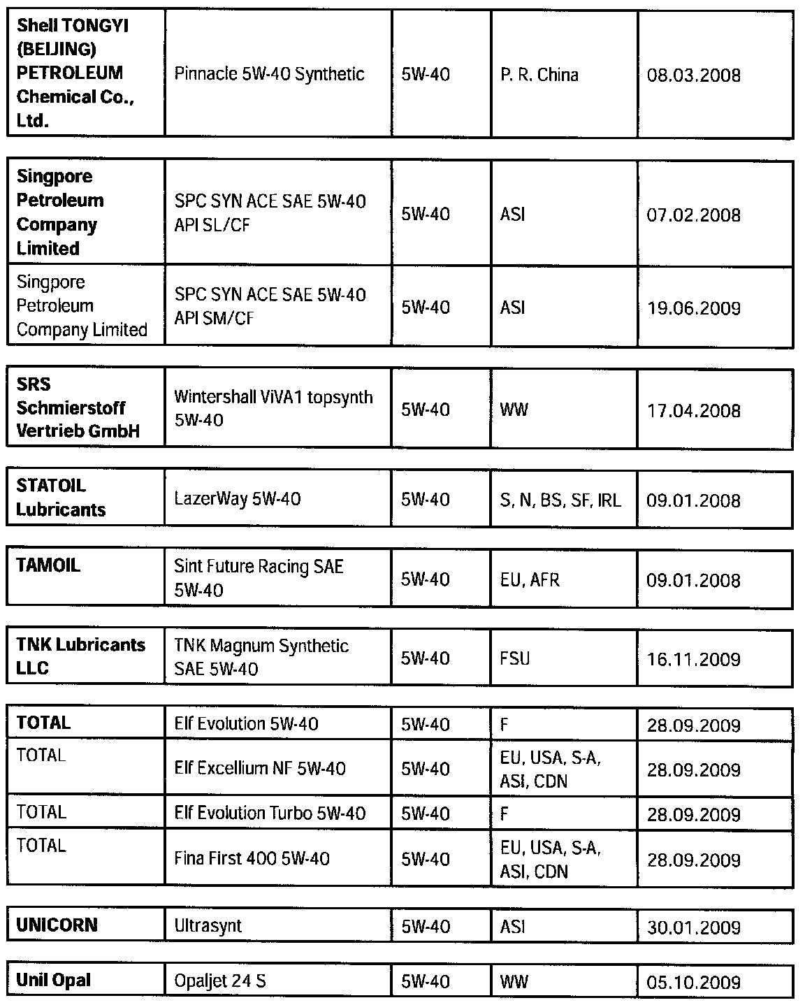 We have reached an agreement with the mineral oil companies which involves setting a time limit on the validity of our engine oil approvals.