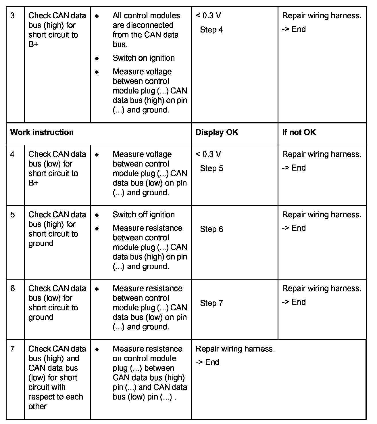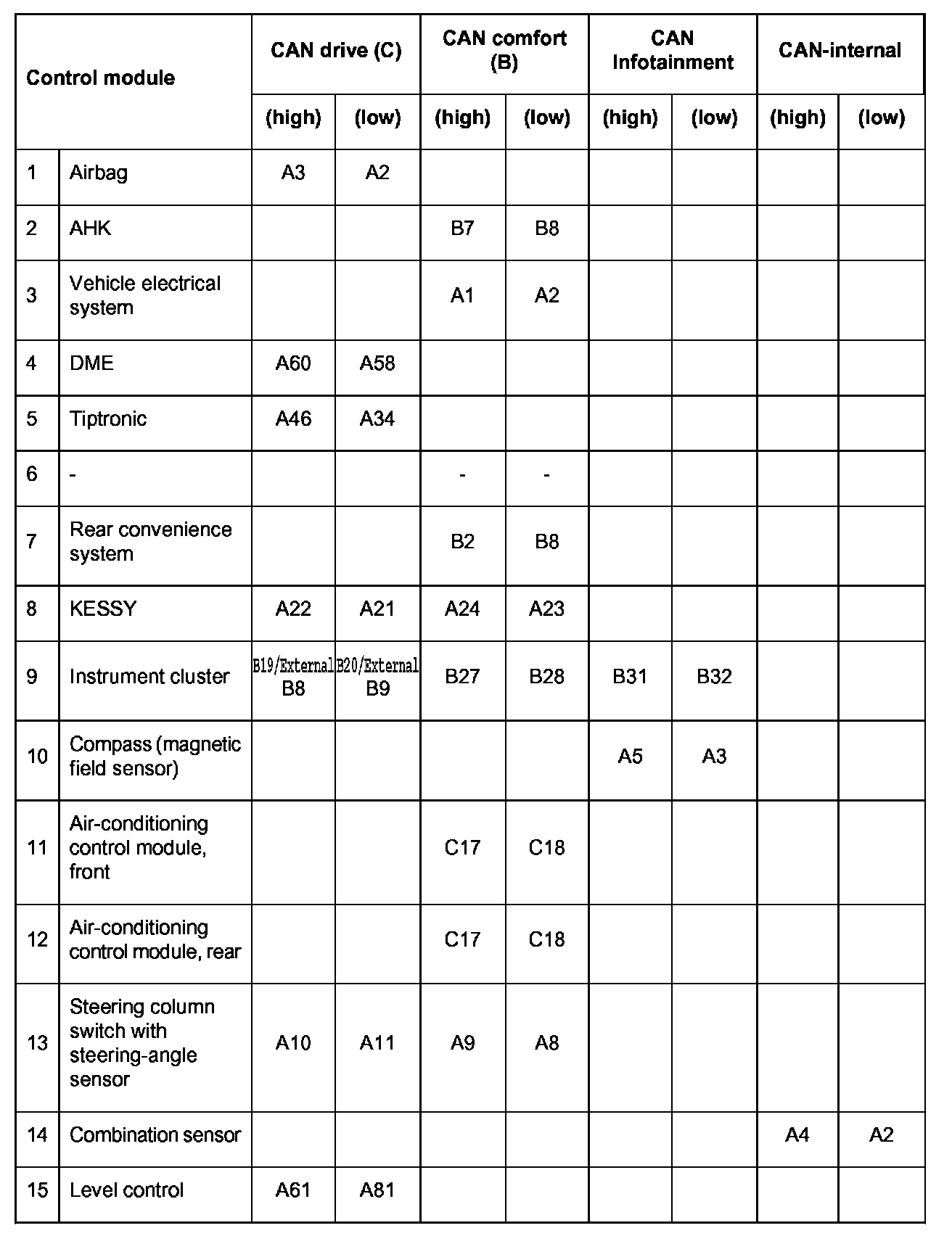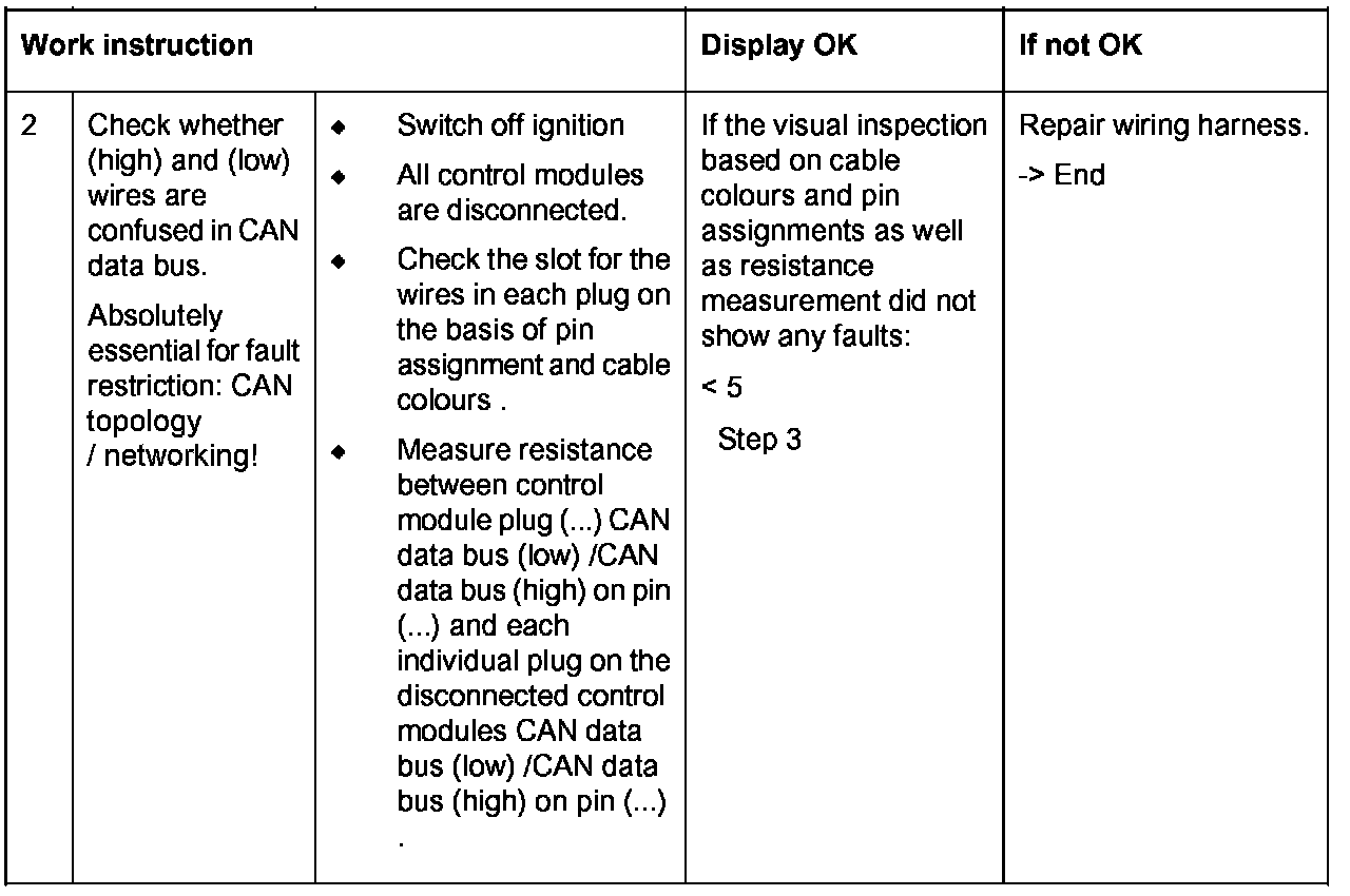 The measurements to be taken are listed in the work instruction below. The measurements must be implemented using the pin assignment shown in the table below, while taking the relevant control module and CAN data bus into account.