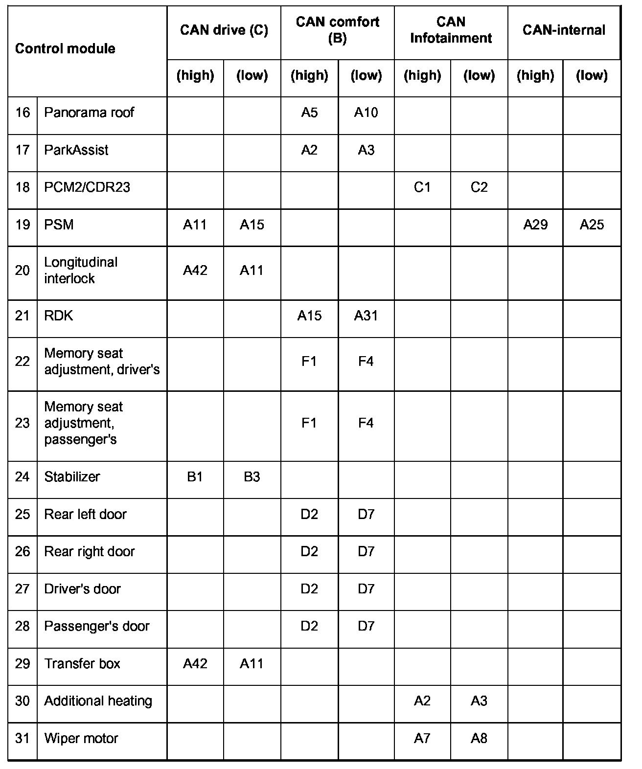 One of the following errors is memorised in all control modules: CAN drive (high/low)/ CAN infotainment (high/low)/ CAN comfort OFF (high/low)