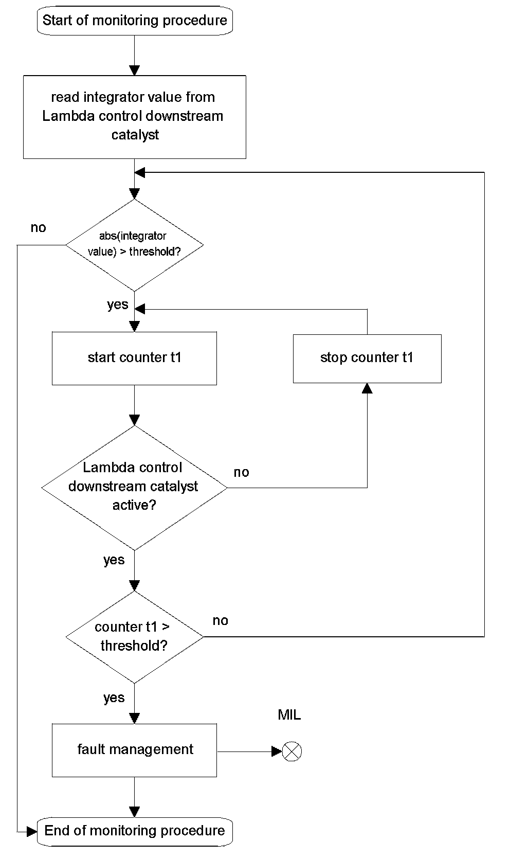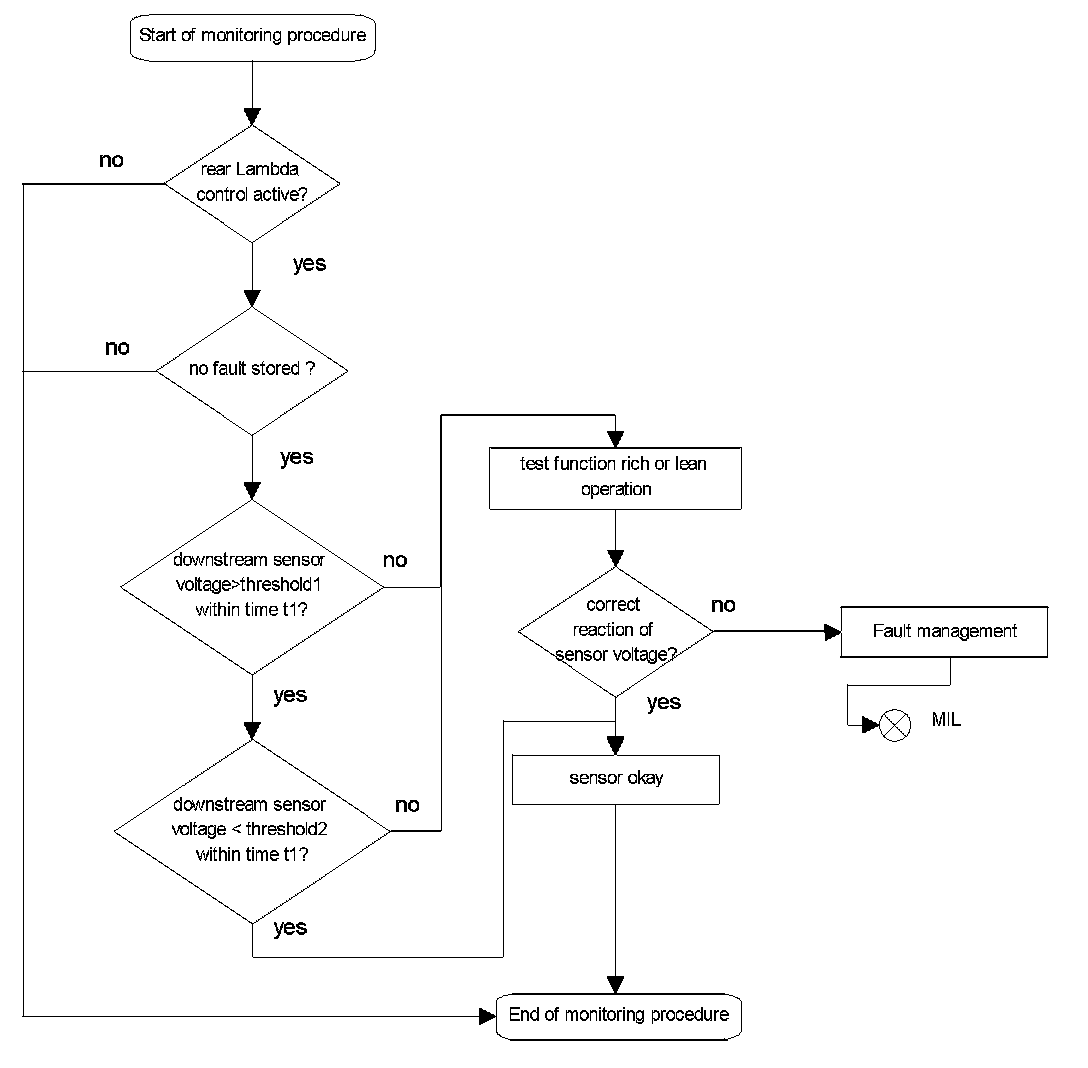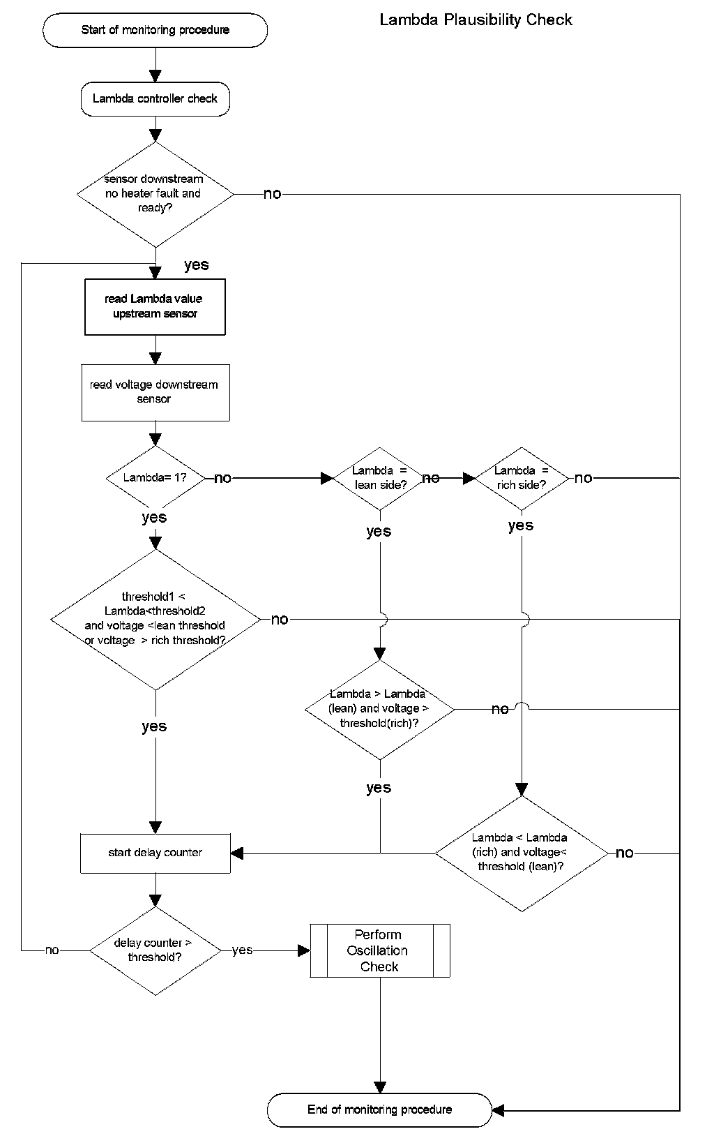 The Lambda value of oxygen sensor upstream catalyst is compared to the sensor voltage downstream catalyst. Additionally, a hardware check is performed by checking the sensor voltage range. Three diagnostics paths covers the air fuel ratio range of Lambda value (e.g. Lambda=1, lean, rich). A corresponding reaction of sensor voltage downstream catalyst is expected.