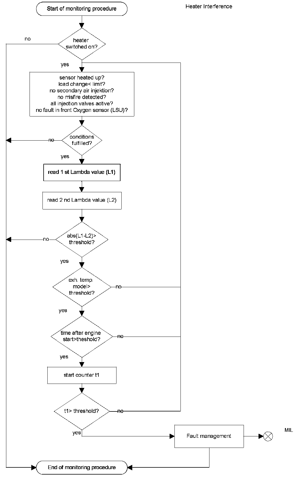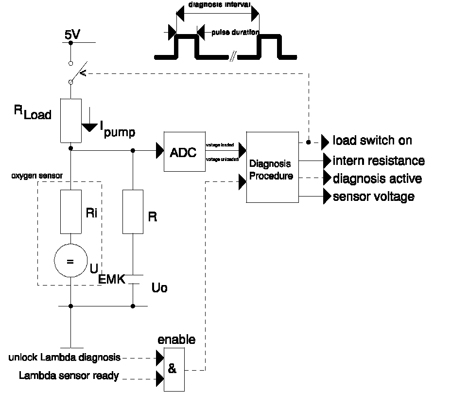 For diagnostic of the sensor heater a specific current pulse is supplied via a load resistance and the voltage is measured. The intern resistance of the sensor heater is calculated with the voltage deviation. The result will be compared with a reference map resistance, which considers aging and sampling deviations. In case of internal resistance > map resistance the diagnosis stores a fault and the MIL will be illuminated.