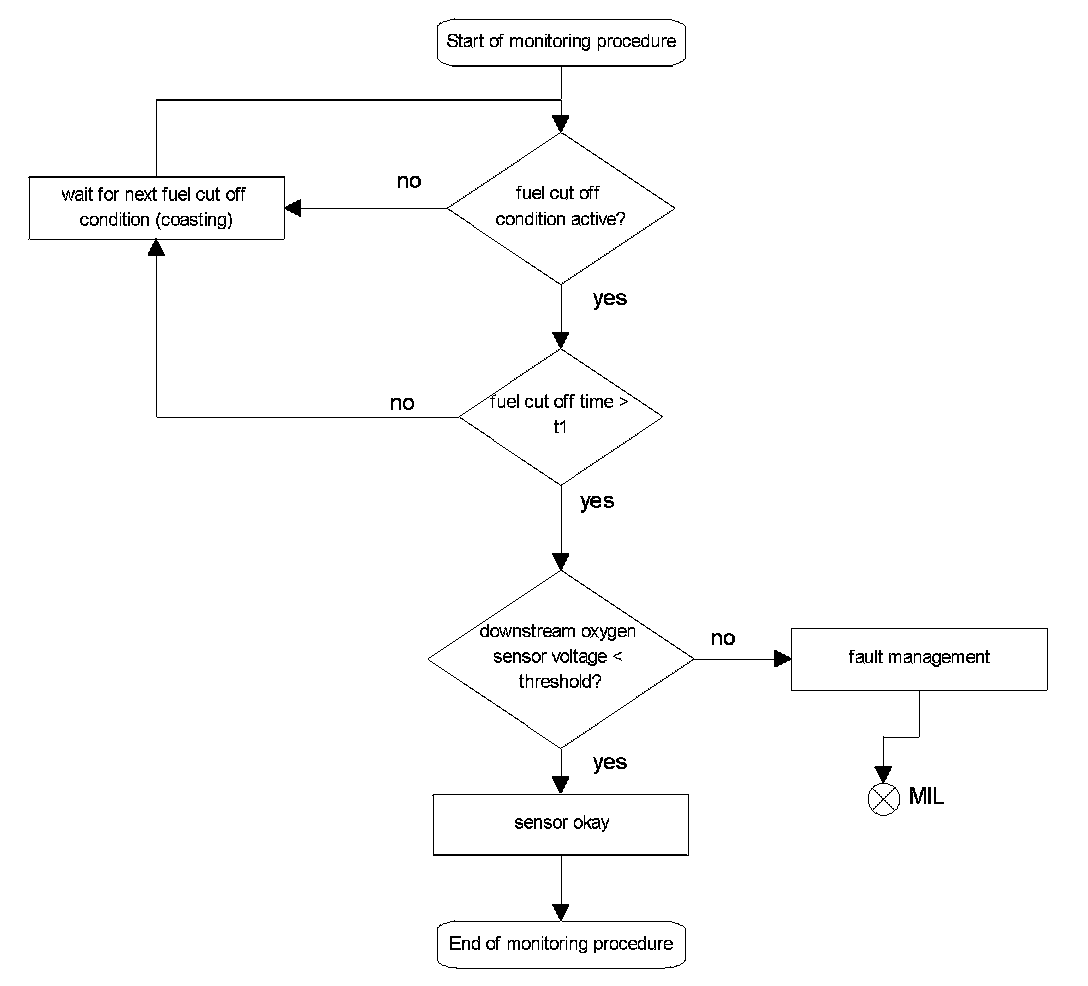 During coasting, the ECM is watching the downstream sensor voltage, which has to go under a specific lean threshold. The diagnostic is enabled if coasting was detected for a specific time and the integrated air mass exceeds a specific threshold.