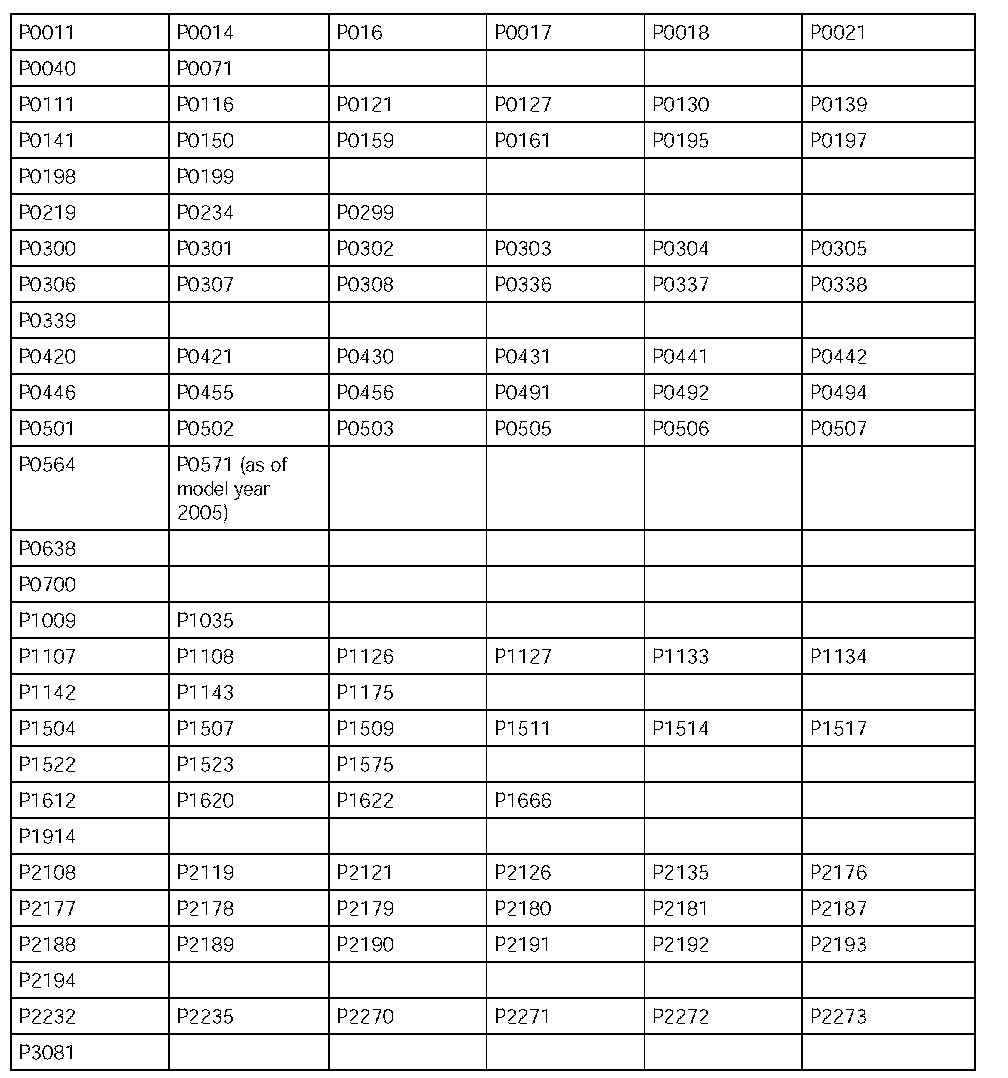 Overview table of P-codes for which the DME control module cannot be the cause