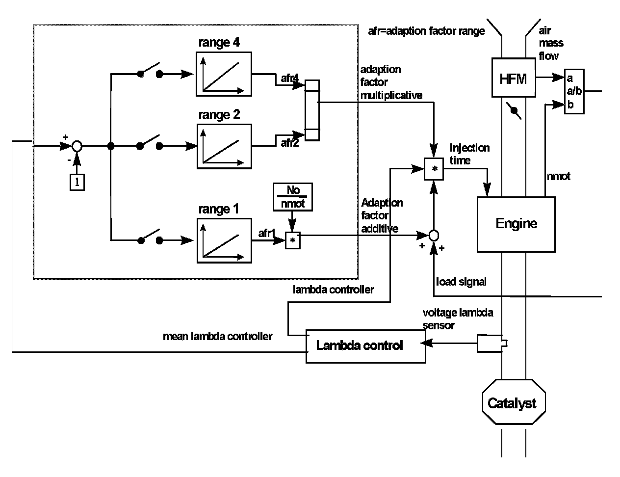 In the ECU the injection time is calculated from: 1) an HFM based basic load signal, 2) an additive correction of the mixture adaption, 3) a multiplicative correction from the lambda controller, and 4) a multiplicative correction of the mixture adaption. All correction factors are calculated at any time during engine operation.